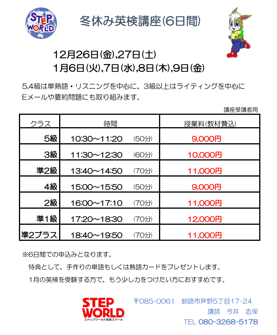 ⛄冬休み英検講座✏️ 投稿日: 投稿者: kushiro24 冬休みに英検講座をします。こちらの教室に通っていなくても受講できます。 特に1月の受験を考えている生徒さんで、ライティング力を上げたい方におすすめです😉 講座内容についてくわしく知りたい方は、メールもしくはお電話でお問い合わせください📩